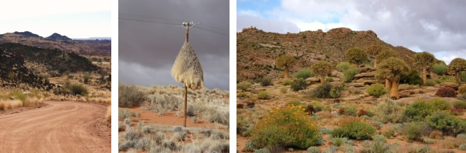 右:低い木立は「アロエディコトマ」という当地特有のアロエの一種。樹齢百年近いものもあり、高さ5メートル近くまで成長。原住民、コイ族やナマ族は空洞になった茎や枝を矢筒として用いたそう。