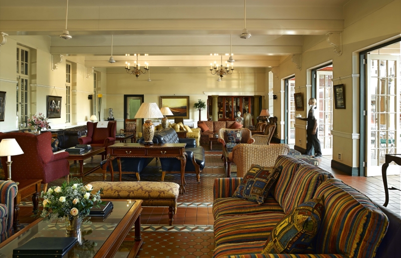 トップ:14両編成を牽引する1938年ドイツ製のマウンテン型蒸気機関車が旅の始まりを盛り上げます。石炭を燃料とするため出発から次の駅までの一駅間 のみ運行。右上:路線表。下:南アフリカの首都プレトリア、O.R.タンボのロボス・レイル専用駅「キャピタルパーク・ステーション」のラウンジ。ヨハネ スブルグ国際空港から車で約30分。