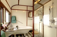 左:「ロボス・レイル」14車両の内、2部屋だけのロイヤルスイートには、大理石で作られたビクトリア様式のバスルームが。ちなみに現在、世界中の豪華寝 台列車の中でバスタブ付きの列車は、南アフリカの「ブルートレイン」と「ロボス・レイル」の2つだけ。中:ロイヤルスイートのベッドルーム。スイートでな くとも、全室シャワー、トイレ付きで、ロボス専用のアメニティーを常備。右:客室ごとに1名の専属バトラーが付き、細部に渡ってゲストをお世話します。