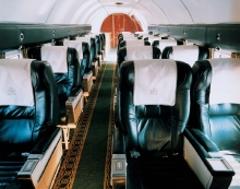 上:上空から野生動物の群れを追うバルーンやエア・サファリはもちろん、ルートによっては列車での移動に加え、飛行機での移動も組みこまれています。写真 はロボス・レイルの乗客専用飛行機ロボスエアー。グループでのチャーターも可能。下:ロボスエアーの客席は革張りでゆったり。