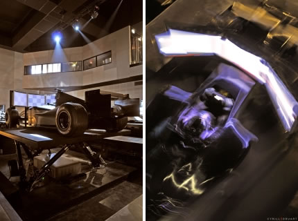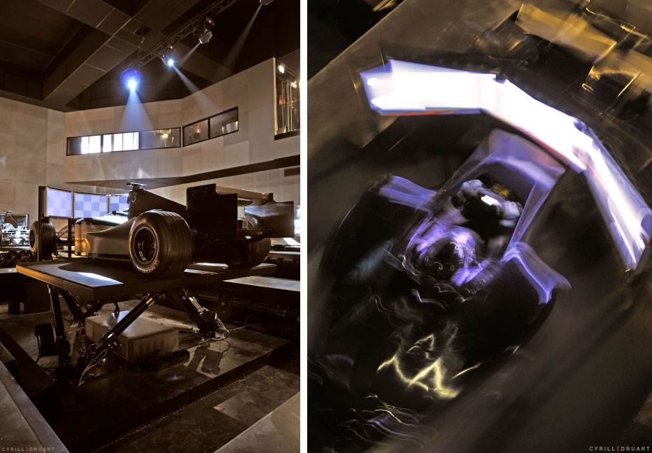 体験できる車は、F1(フォーミュラワン)、ラリー、プロトタイプが各6台の、あわせて18台。フランスやオランダ、英国のシミュレーション技術の専門会 社によって共同開発されたそれは、なんと車体が実際のレーシングカーと同サイズ。 上下や前後左右、傾きといった動きの自由さを図る「自由度」はシュミ レーションとしては最高レベルの「6」。この「自由度6」のマシンは、「ゲームセンターの体感ゲームを、ちょっと激しくした感じかな?」などという、あり きたりな想像を大きく裏切る脅威の機動性を誇ります。つまり、スピードやコーナーリング、ブレーキのGはもちろん、スリップや傾斜、衝突時のショックな ど、モータースポーツのセンセーションを超リアルに体感できるのです。もちろん、サラウンド音響システムで、エンジンの轟音も体幹にズドンと響き、臨場感 も十分。そのリアル感は動画を見ていただければおわかりいただけることでしょう。一回の体験時間は7~10分で、まずブリーフィングと練習が行われます。