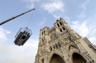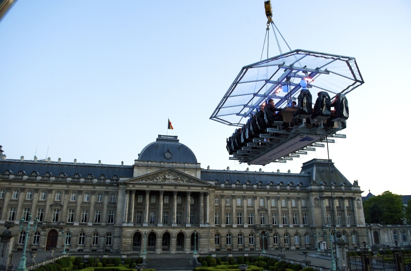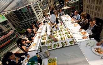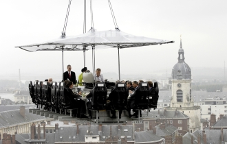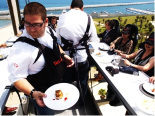 お客はまず、ジェットコースターに乗るかのように安全装置を装着して、テーブルに着席。このテーブルごと、クレーンで50mの高さまで吊り上げられていきます。足元の台から足をはずせば、もちろん空中にぶらぶら…。テーブルには最大22人が座ることができ、真ん中には料理人やソムリエら、必要に応じて3人まで乗ることが可能。安全管理上、火の使用はできませんが、電磁調理器は使えるため、最後の仕上げや皿への盛り付けは、上空で行われます。空中でのディナーの感動と恐怖?の様子は、言葉で説明するより、写真やビデオを見ていただければ一目瞭然のはず。
