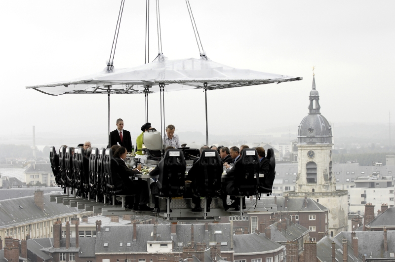 文字通り、空の上のディナー「ディナー・イン・ザ・スカイ」と題されるこのコンセプトは、ベルギーで誕生。空に浮遊する“テーブル”は、ベルギーの安全基準をクリアしており、“空で食事をしたい”というイベント主催者に貸し出すビジネスモデルをとっています(リース料の目安は12000ユーロ)。これまでは主に企業が主催し、ラスベガスやブリュッセル、ロンドンなどで開催。ディナーだけでなく、結婚式や演奏会にも利用されています。