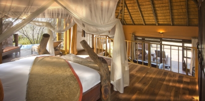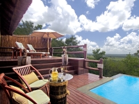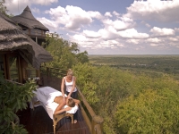 右写真:もうひとつのスイート「マスター・スイート」。スイートには、キングサイズベッドとバスルーム、屋外シャワー、デッキのあるラウンジルーム、プール、書斎、CDプレーヤーなどを備えている。左写真:草原を見下ろすスパ。アフリカ伝統の原料を使ったスキンケアが受けられる。
