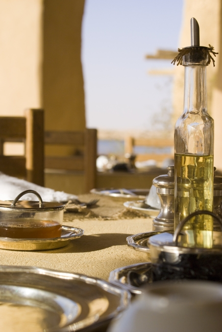 ホテルの光源となるのは、蝋燭とランプ、そして満点の星。気温が下がる季節には、火鉢で暖を取ります。電気のない場所にいながら、砂漠の風から建物を守り、室内の気温を快適に保つことができるのは、古人の智恵を継承した建築技法のおかげ。伝統技法とは、塩湖から採取した塩と土地の泥を混ぜたカルシフ(Kershef)という材料を使うこと。さらに天井には椰子の木、ドアや窓にはオリーブの木を採用。ちなみにガスはあるので、お湯は使えるそうです。