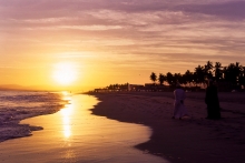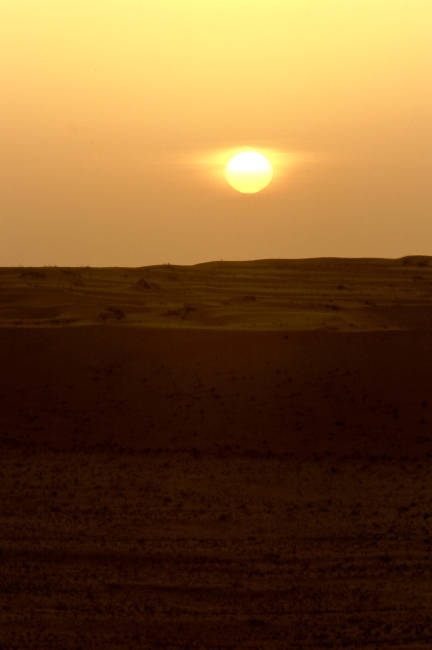 太陽の傾きと共に、はちみつ色をしていた砂漠は、徐々に赤茶色へと変わっていく。風紋が美しい影を作り出し、そのコントラストが抽象画のような美しさを見せる。小高い丘の上に座り見渡すと、360度の砂漠の夕焼けが、はるかかなたまで続いている。巨大な太陽は、あたり一帯をオレンジ色に染め、西の地平線へ。そして、まるで大地に溶けていくようにゆらゆらと沈んでいく。他のどこでも見たことのない、壮大なサンセットだ。