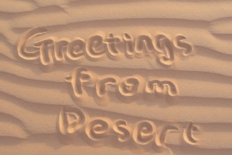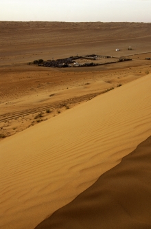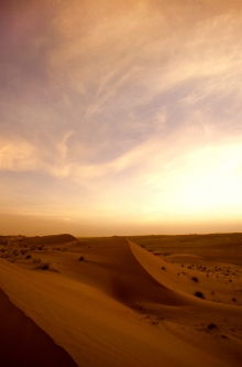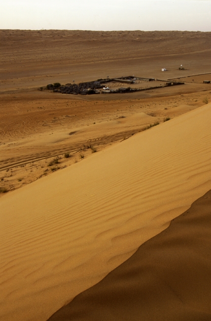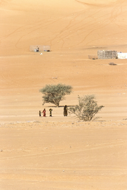 マスカットから、ガイドと共に頑丈な四駆車に乗り込み、南へ約200km。いくつかの小さな集落を通過した後、砂漠はいきなり目の前に現れる。「ここから砂の海」といった感じで、驚くほど境界がはっきりしているのだ。走りやすいようにタイヤの空気を抜き、見渡す限りの砂の大地に乗り出す。いくつか残された轍のあとをたどるように進む。地図を見るとわかるが、一応砂漠の中にも道というか、トレイルが伸びているのだ。