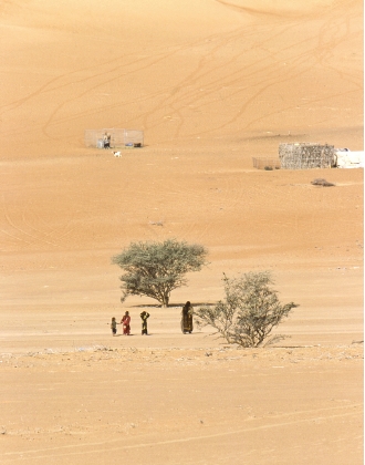何もない砂の上に建つバラスティに向かうベドウィンの母と子ども。