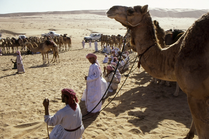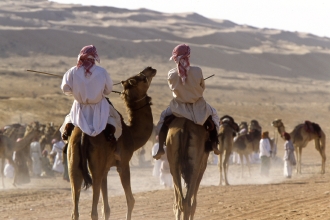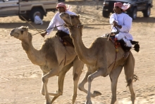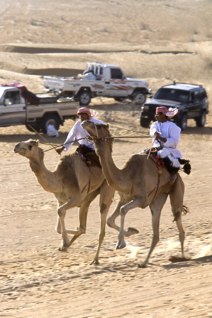 特別にレーストラックがあるわけではなく、広々とした砂の上、人垣がそのままフェンスとなって即席の競技場となるようだ。レースは2頭ずつが同時に走るデュアルで、500mほどを一気に駆け抜ける。時速50km以上。ふだん緩慢な動作のラクダが、エンジンでも付けられたかのような勢いで砂を蹴散らしながら走っていくのだから驚かされる。騎手たちはいかにもりりしく誇らしげだ。ルールはよくわからないが、とにかくみんな興奮状態。砂とラクダがベドウィンのDNAを刺激するのだろうか。