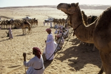 途中、ベドウィンの家に立ち寄る。8000年以上も前から砂の上で生活してきた砂漠の民。ナツメヤシの固い枝で作られた「バラスティ」といわれる建物に暮している。実に簡素なたたずまいだが、容赦なく入り込もうとする砂をブロックしつつ、しかも通気性を確保してくれる。50℃を軽く超える砂漠の灼熱地獄にありながら、室内は思った以上に快適だ。砂の上にラグを敷いただけの居間に通され、オマーンコーヒーと甘いデーツの実で伝統的なもてなしを受ける。この家では親戚の2家族が一緒に暮らしている。ラクダを育て、それを売るのが主な収入源。値段はピンからキリまであるが、時には高級車が一台買えるほどの値がつくこともあるという。一見貧しい暮しに見えるが、実は政府から街の住まいも支給されているのだとか。彼らはそれを人に貸し、自ら好んで伝統的な砂上生活を送っている。