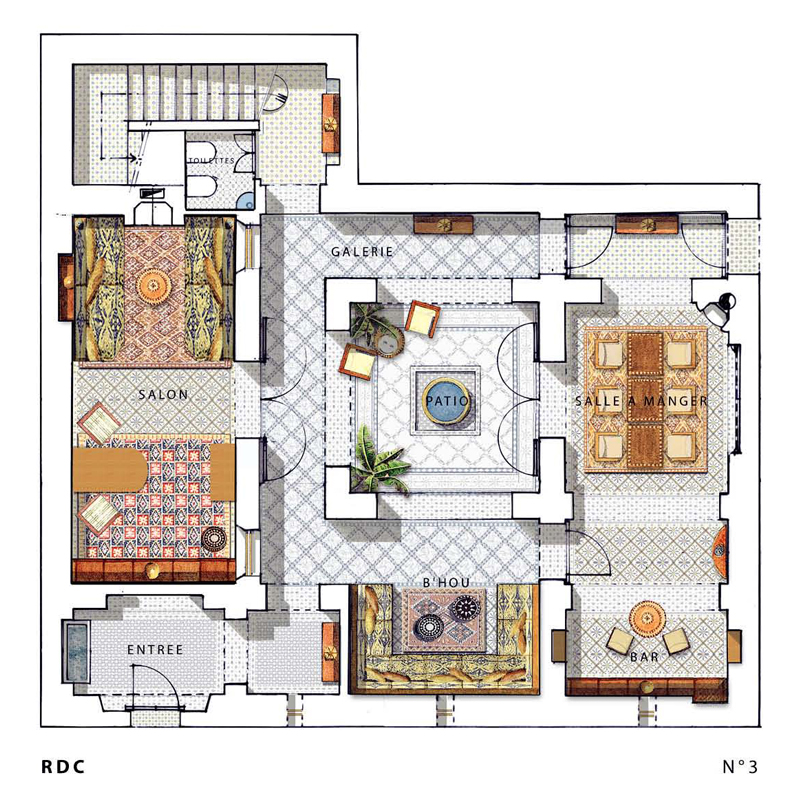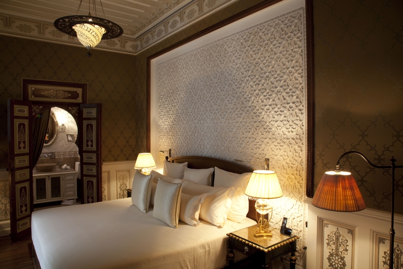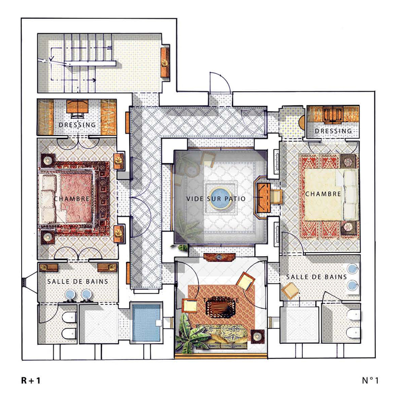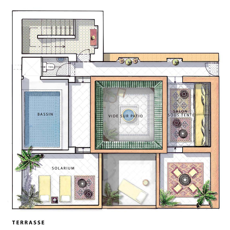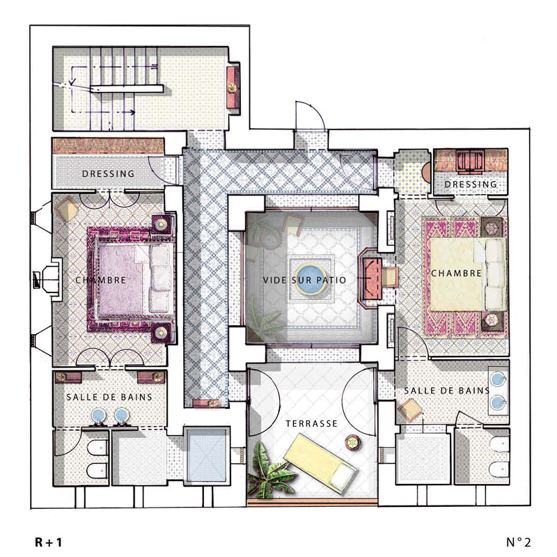 そんな数あるリヤドタイプのホテルからファウスト諸氏にご紹介したいのが、2010年にオープンした「ロイヤル・マンスール・マラケシュ」ホテルだ。塀に囲まれた3.5ヘクタールの敷地には53邸のリヤドやスパ専用棟、プール、アンダルシア風の庭園が広がり、市街地にありながらも静かな時間が流れている。ゲストは3階(もしくは4階)建てのリヤドを1邸まるごと与えられる。中庭を中心にリビングやバー、ロビーの広がる1階、ベッドルームの置かれた2階、そしてプライベートプールや暖炉が配された屋上のテラスという最高にラグジュアリーな邸宅は、130㎡の1ベッドルームから2000㎡の4ベッドルームまで5タイプ。これを所有するのが現モロッコ国王のムハンマド6世と聞けば、贅を尽くした調度品や350名ものスタッフによる洗練されたもてなしにもうなずけるだろう。ロイヤル・マンスール・マラケシュは国賓気分にさせてくれる特別なリヤドなのである。