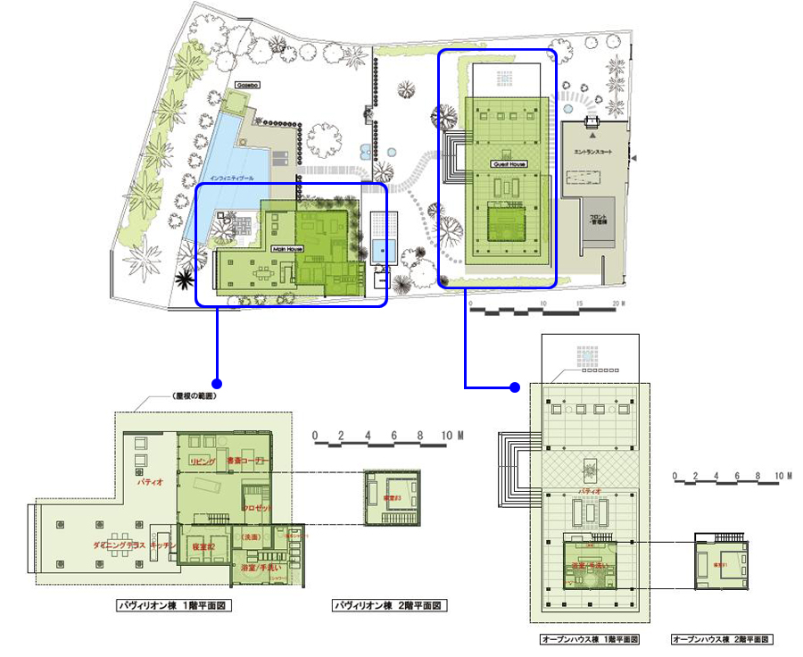 ロングハウス棟:床面積199.56㎡(ピロティ140.84㎡含む) パヴィリオン棟:床面積158.62㎡(ピロティ48.2㎡含む)/ベッドルーム×3(全室バスルーム(orシャワー)付・LDK