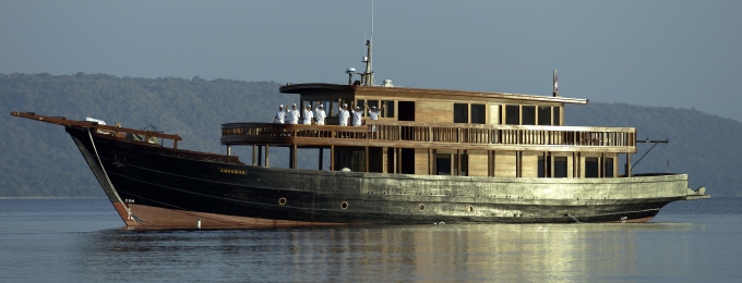 アマンイカンは、特注された全長32メートルの最新沿岸クルーザーである。クラシカルなデザインは、インド洋で香辛料取引が盛んだった時代の貿易船をイメージしたといい、いにしえのロマンスを醸し出す。迎え入れるゲスト数は最高でも3組と、カップルやファミリーのプライベートクルーズに理想的だ。