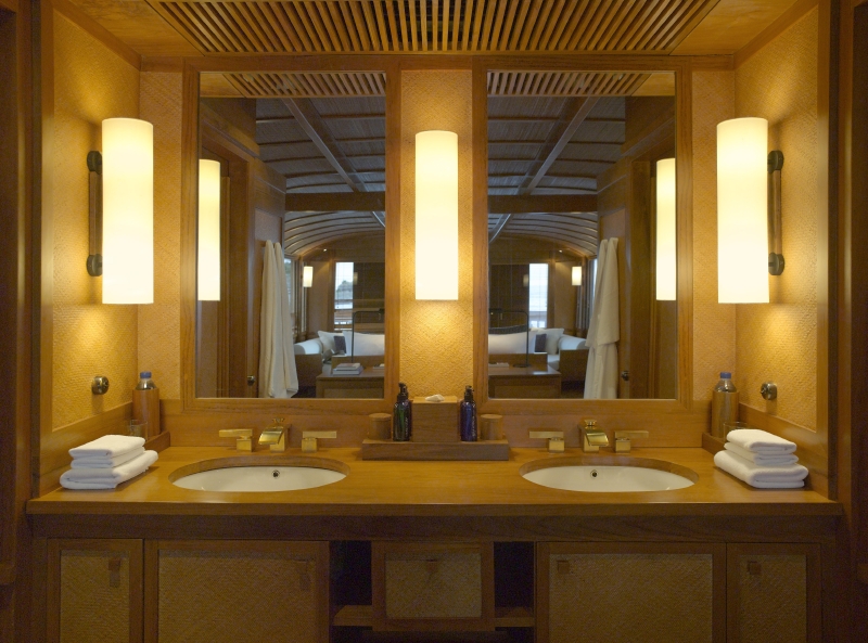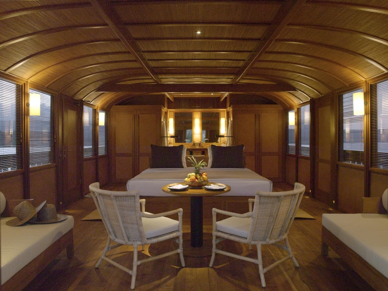 3方を窓に囲まれ、270度の景色が楽しめるのはアッパーデッキ後方のメインキャビン(ゲストルーム)。甲板には大きな専用テラスが広がり、太陽と海を心行くまで独り占めできるようにデザインされている。セカンドキャビンとサードキャビンもあり、いずれも、エアコン、バスルーム、シャワー、トイレ、ワードローブを完備。白、ハニー、ベージュで統一された部屋に流れる隠遁とした静かな時間は、隠れ家リゾートの代名詞を誇るアマンリゾーツならではの、上質な作りといえるだろう。