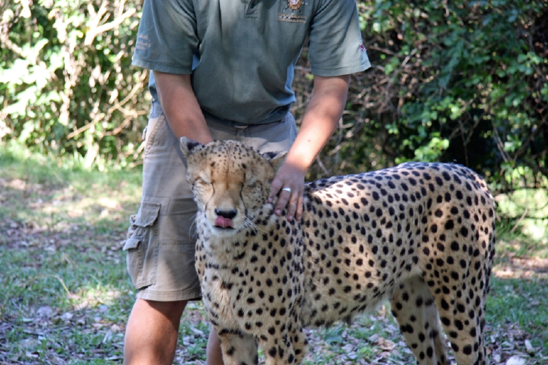 「触っても大丈夫ですよ」。ヨハンが、あたかもゴールデンレトリバーでもいるかのようにチーターを撫でる。突如として野生に目覚めることはないのか? チーターをこれほど間近で見たことのない人間としては、恐る恐る手を伸ばしてみるのだが、そっと触るとビロードのような毛並みが艶々として気持ちがいい。思い切って首や鼻筋を撫でてみると目を細め、腹を見せながら前脚を折り曲げるではないか。目の縁(ふち)から口元には、涙のように流れる黒い線。まぎれもなくチーターだ。イーストロンドンの空港に降り立ち2時間で美しい動物と戯れる。東京から南アフリカまでの旅の疲れが飛ぶ瞬間だった。