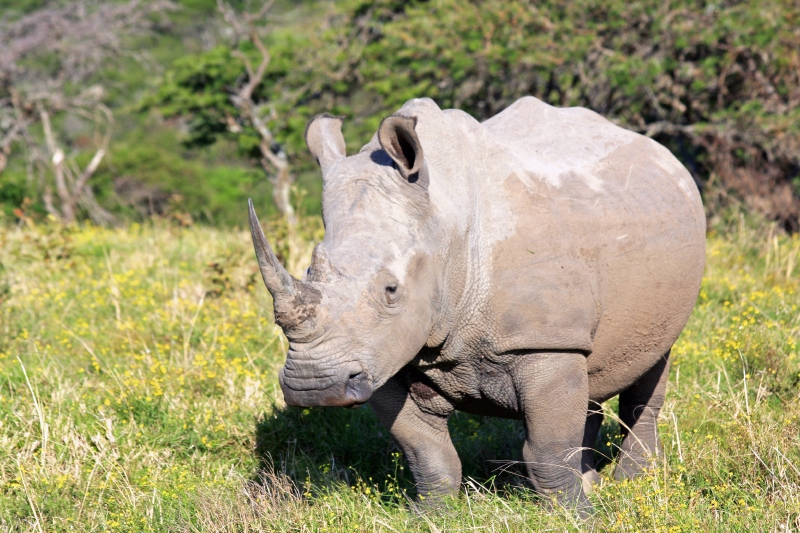 安全なゲートの外に戻ると、すぐにユニークな角を持ったアンテロープに出会った。さらに食事中のキリンの親子にも接近。「今日はたくさん見られるな」とヨハン。そして「これはついているぞ!」と車を止めた先にいたのはシロサイだった。ビッグファイブのひとつではないか! ゾウだろうが車だろうが、動く大きなモノに突進してくるサイには注意が必要だ。少し遠くに車を止め、息を殺してじっと眺める。ピンクがかったボディは艶々した岩のようで、少し眠そうに目をトロンとさせている。サイに気を取られていたが、ふと見ると、離れたところにはオグロヌーの群れが来ていた。こちらもすごい迫力だ。さらに、その奥をシマウマたちが駆け抜けていく。「まったく、なんて場所だろう」と思っていると、それを見透かしたようにヨハンが言った。「見つけられる日と、ぜんぜんダメな日があるんだが、今日は最高だよ!」。