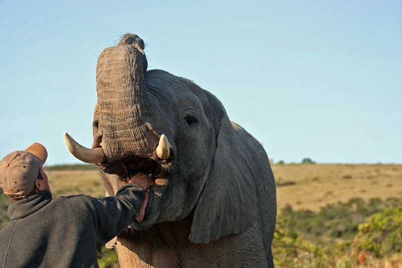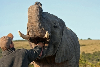 陽が少し傾いてきた。無線で連絡を取っていたヨハンは「次はゾウを見に行こう」といい、「ほら、ゾウが通った後だよ」と倒された木々を指した。ブッシュを抜けて平地に出ると、3頭のゾウが待っていた。そう、まさに私たちを待っていたのである。傍らでは飼育係のスタッフたちが微笑む。ここではエレファントバックサファリもやっている。エレファントバックサファリとは、ゾウの背に乗って出掛けるサファリだ。車を降りて触ってみると、その皮膚は想像していたよりもずっと柔らかい。5cmはあるだろう長いまつげの目に見惚れてしまう。気付くと、夕日がまぶしくゾウたちを照らしていた。