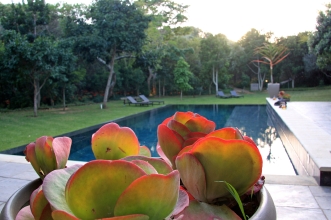 プラナロッジの中庭。隣にラウンジバーとレストランがあり、奥の林を抜けて海に出る。昨年オープンしたばかりで、日本人の宿泊客は稀。