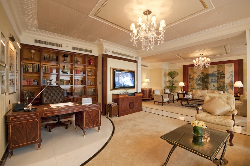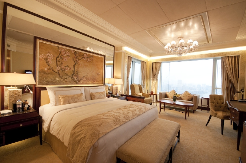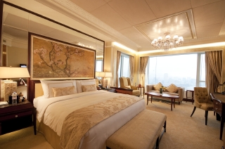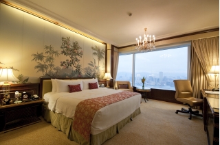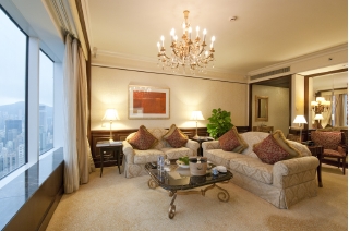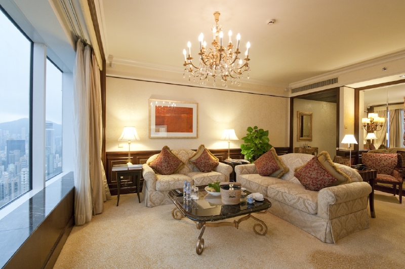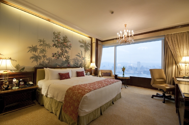 ヨーロピアンと東洋様式が融合した伝統的かつ格調高いインテリア。ダークブラウンを基調としたウッディなゲストルームには、瀟洒なシャンデリアが下がり、窓外からは摩天楼とヴィクトリア湾、向うのカオルーンも一望する。