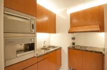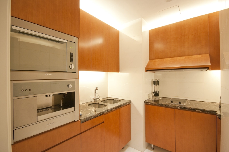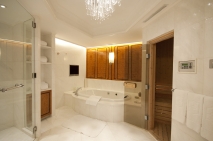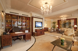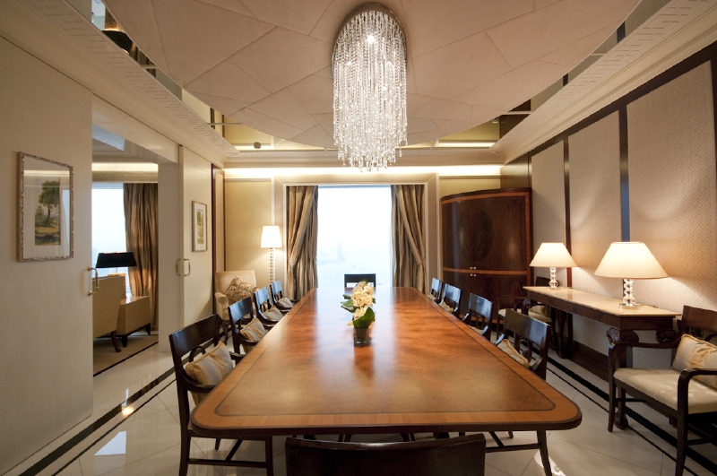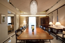 リビングとベッドルームに加え、会合にも使える8人掛けのダイニングテーブル、キッチン、書斎、バスルームにはスチームサウナも。210平米。1室1泊HK$37,600+サ10%。