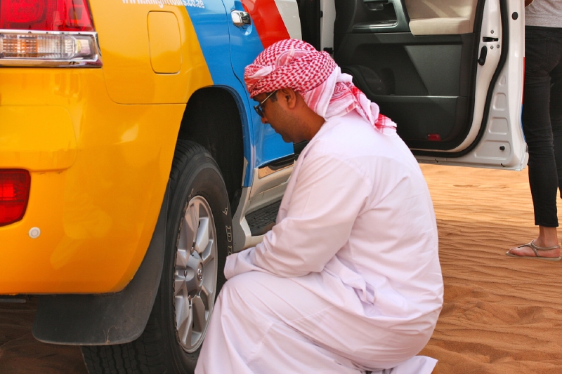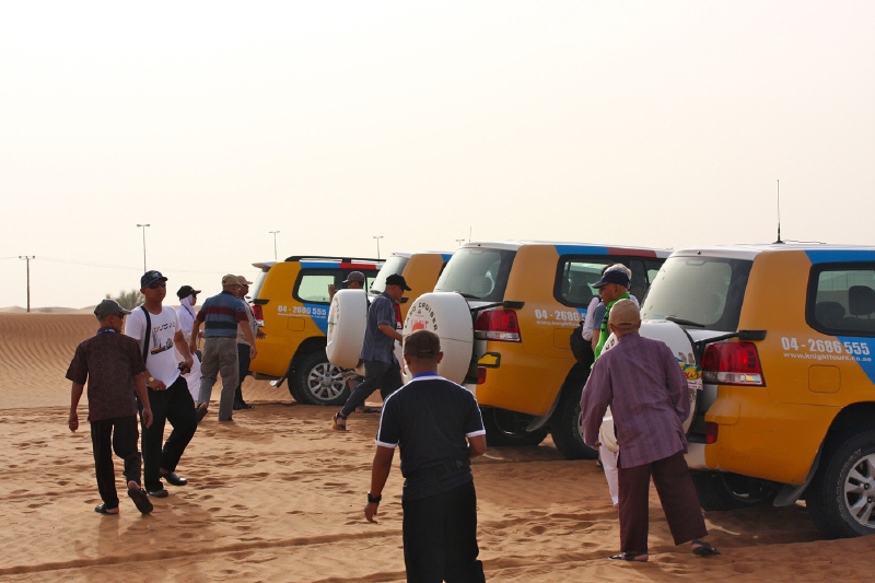 降りると、周りには同じランドクルーザーが並び、人々が外に出ていた。どの車もタイヤの空気を抜いている。そうか。砂漠では空気圧を低くしなければスタックしてしまうのか。となると今の砂丘越えは、「パンパンのタイヤでも俺はやれるぜ」という腕の見せ所だったわけだ。来た方向に目を向けると、みんな勢い良く突っ込んでくる。なるほど。過激なオープニングに、今更ながらに心臓が高鳴ったのだった。