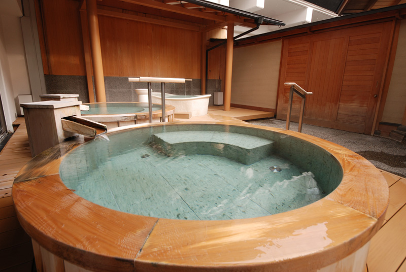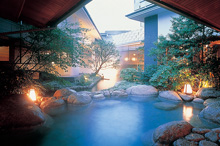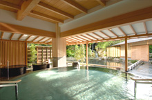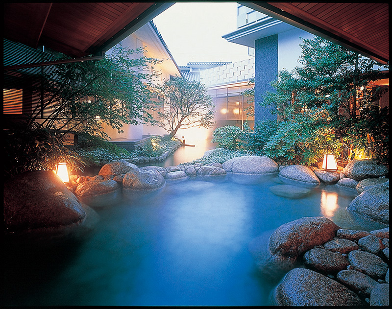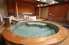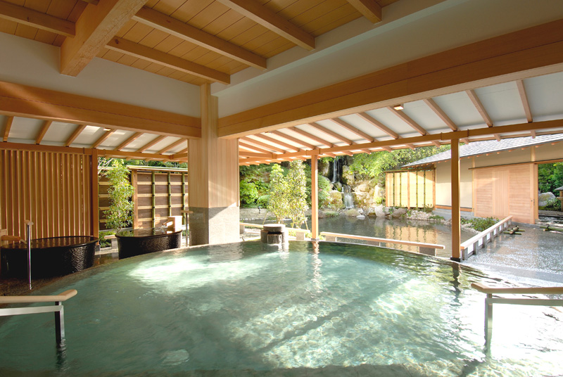 雄大な自然に囲まれたホテルニュー水戸屋の自慢はなんといっても、薬師の湯だ。それぞれ趣の異なる「水心鏡」「月宮殿」「梅の粧」という3つの大浴場内に、16種のお風呂が用意されており、湯巡りを愉しむことができる。例えば「水心鏡」にある「満月風呂」は月明かりが差し込む半露天風呂。風光明媚な空間で名湯に酔いしれる時間は格別だろう。また「月宮殿」には、露天岩風呂のほか、桧の香りが心地良い桧樽風呂や桧丸太風呂などがあり、自然の恵みを改めて感じさせてくれる。