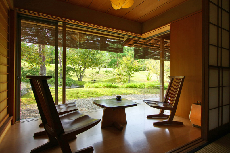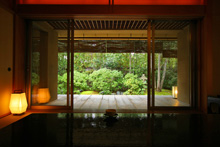 重厚な門をくぐると、そこに広がるのは約8,000坪の日本庭園。四季折々、豊かな色彩と表情を見せる圧巻の庭園は、どの部屋からも愛でることができ、忙しい毎日を送る現代人の心のスイッチをそっとオフにしてくれる。部屋は、広々とした空間が嬉しい数寄屋風造り。全26室のうち、10室は露天風呂付きで、プライベートな時間を堪能することができる。