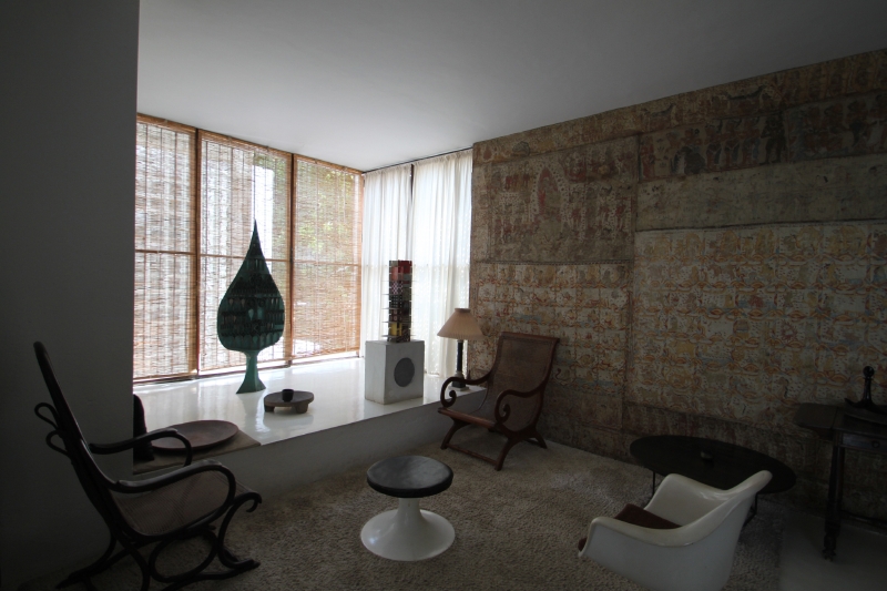 バワが亡くなったのは2003年のこと。まだ10年もたっていない。だからなのだろう、かつての生活の息づかいがリアルに感じられて、ドキリとさせられる。 特別に入れてもらったプライべートルームには、生前のバワが愛用した眼鏡や時計、旅行鞄などが、いまも主の帰りを待つかのように置いてあった。そして、バスルームの壁には、青春の日、イタリアを旅した時のセピア色の写真が貼ってあった。二階のゲストルームで目を引くのは、リビングルームに置かれたグリーンの菩提樹をかたどったオブジェだ。バワとしばしばコンビを組んで活躍したアーティスト、ラキ・セナナナキの作品である。1970年、バワは大阪万博のセイロンパビリオンを設計した。残念ながらいまはもう見ることは出来ないが、熱帯建築家が唯一、日本で手がけた作品である。そのパビリオンのシンボルだったのが、これを巨大にしたオブジェだった。岡本太郎の太陽の塔がそびえていたあの万博で、バワの建築とセナナナキの菩提樹が大阪の空を仰いでいたのだ。