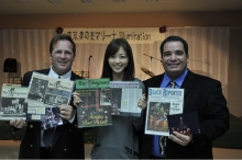 上左・上中:ドルフィン、スマイル、ツリーやサンタクロースなどさまざまなモチーフが。夢の島マリーナをイルミネーションヨットが彩ります。上右:「マリーナ・デル・レイ」の優勝者、Mr. Colin I. KasterとMr. Peter Elis。このイベントのイメージモデルの近藤圭都さん