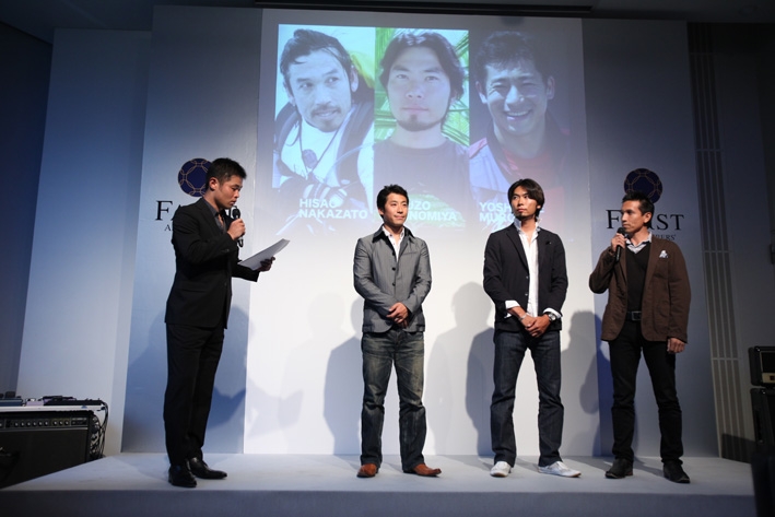 左:当クラブの活動を強力に後押しするFaust A.G.のスーパーバイザー、左からエアロバティック&エアレースパイロット室屋義秀氏、プロフリーダイバー篠宮龍三氏、海洋冒険家・プロウィンドサーファー中里尚雄氏。もう一人、レーシングドライバーで冒険家の片山右京氏は都合にて欠席。ビデオレターが寄せられた。司会者は元Jリーガーで今はサッカー解説者として活躍する小倉隆史氏。右:全チームのキャプテンをゲストの前でお披露目。