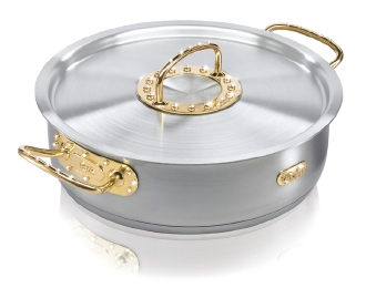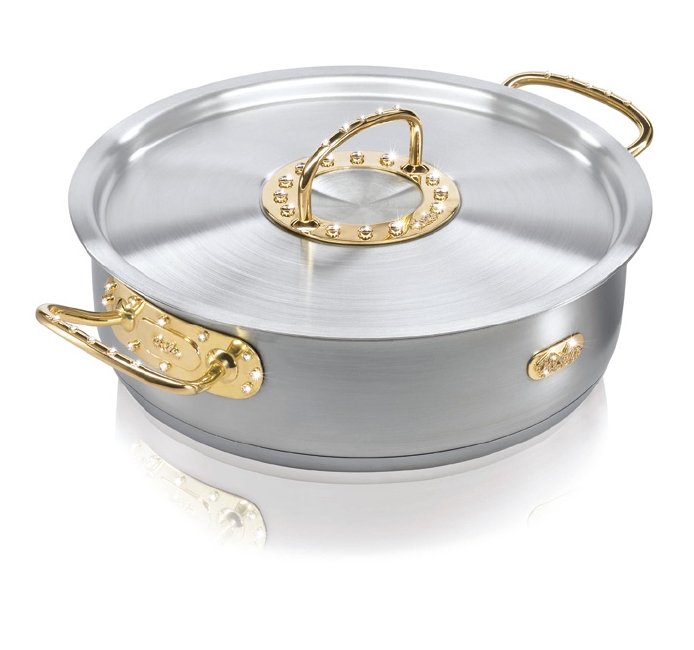 「ダイヤモンドポット」は、フィスラー・ステンレス鍋の代表的なシリーズ「プロコレクション」のシャローパンを原形として作られており、鍋の本体は最高級18 /10ステンレス製。鍋蓋と本体の取っ手、フィスラー社のロゴに739gの18金と270粒のダイヤモンド(合計13カラット)が使用されている。さらに、ダイヤモンドの一粒一粒を匠が心をこめてカットし、イーダー・オーバーシュタインの金細工職人が手作りで制作。ドイツ宝石学協会の鑑定にも合格済みだ。豪華な装飾が施されたアートではあるが、料理はもちろん、食器洗い乾燥機の利用も可能というから、その製造技術の高さに驚かされる。