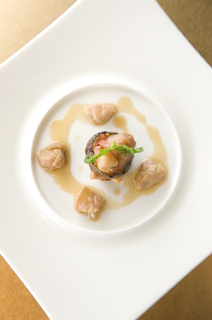 左:茄子と胸腺のタルト仕立てとフォッサチーズ 右:裸のラビオリ“ニュディ” エンドウ豆のソース