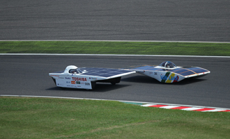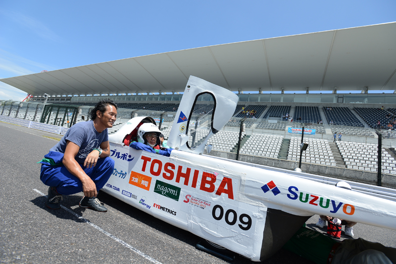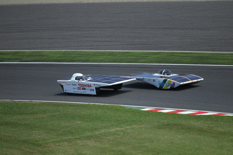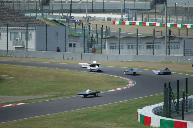 そして翌日、いよいよ本戦がスタート。レースは序盤から、昨年度優勝の芦屋大学ソーラーカープロジェクトが勢いある走りを見せる展開に。チーム篠塚は、ファーストドライバーを篠塚が務め、5時間耐久レースを制するための戦略として、1周6分後半から7分前半台という我慢の走りで8位をキープ。またスタート30分過ぎた頃から厚い雲がサーキットを覆い始め、ソーラーパワーを十分に受けられない状態に。セカンドドライバーの堀主知ロバートも我慢の走りでサードドライバー大嶋健一にバトンをつないだ。パワーを温存したチーム篠塚はここから猛チャージをかけ、1周6分10秒前後のスピードで次々と他チームを猛追したが、あと一歩及ばず3位に終わった。表彰台は死守したものの、課題が多く残る初戦となった。9月に南アで開催される「Sasol Solar Car Challenge South Africa」に向け、課題をクリアし新たな気持ちで挑戦に臨んでほしい。