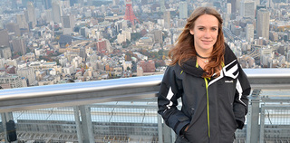 The cute 17-year-old poses playfully at the Roppongi Hills viewing deck. The Angry Birds ski cap was a gift from friends she made on her trip around the world.