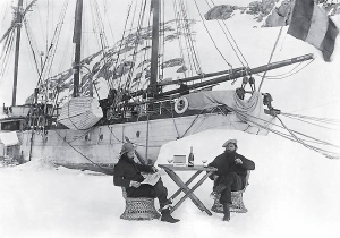 南極大陸到達を祝って、“コルドン ルージュ”を飲むシャルコー(左)。