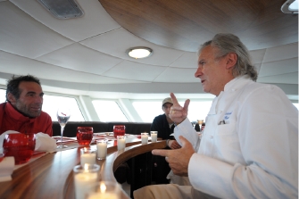 そんな過酷な冒険にも、きちんとお楽しみが用意されているのがこの旅のスペシャルなところ。旅のサポーター企業でもあるG.H.マムが彼らのために、ミシュラン星シェフによるユニークな“秘境ディナーパーティ”を主催しているのです。4年間で7回開催する計画で、第1回の場所はなんとグリーンランド。プロヴァンスにある「ウストー・ド・ボーマニエール」のシルヴェストル・ワイード氏がそこで料理を振舞ったのが7月のことでした。続く10月には、シャルコーの真似をした南極で、ランスの三ツ星レストラン「レ・クレイエール」の元オーナーシェフ、ジェラール・ボワイエ氏が腕によりをかけた料理が振舞われたのです。秘境の地でいただく一流料理の味は、そこで食べた人にしかわからない感動があるに違いありません。