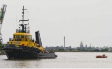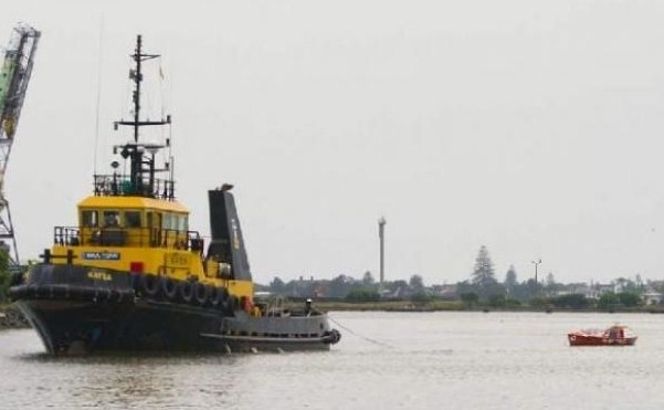 ニュージーランドの船にえい航されてニューカッスル港へ入るベリーニ氏のボート