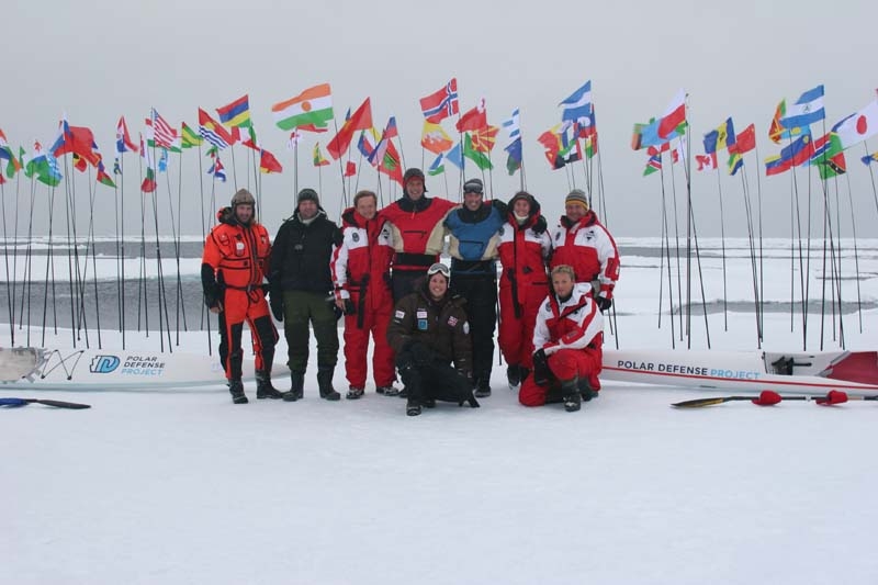 過去には、北極でのスイムに挑んで「人間北極グマ」との異名を拝し、英国が誇る英雄の一人としてブレア前首相にも讃えられている彼は、約20人に及ぶチー ムに支えられ、“失敗”を目標に全力漕櫂。海氷と海氷の間を縫うように漕ぎ進み、“不運にも”順調な場合は2週間前後で北極点に到達すると想定されていま したが、嬉しいことに、出発して5日目に断念されました。北極点に到達できた場合、氷床が溶けつつあることを全世界に警告する意味で、世界192カ国の国 旗を立てる予定でしたが、“失敗した”にも関わらず、喜びの余りに最寄りの氷床に192本の旗を立てて記念撮影(撮影後、即撤去!)。