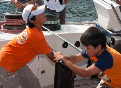 必死な表情でパンゲア号の帆をあげる子供たち。日常では体験できない冒険ゆえ に、体力が続かない!