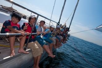 横浜と横須賀の沖合を進む約1時間、子供たちはパンゲア号の帆を張るのを手伝い、巨大な船が風の力だけで進むのを目の当たりにすることができました。都会っ子たちにとっては、とても新鮮で刺激的な体験だったことでしょう。