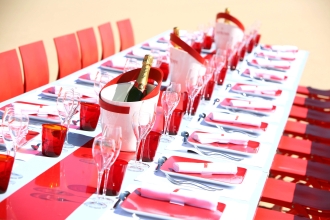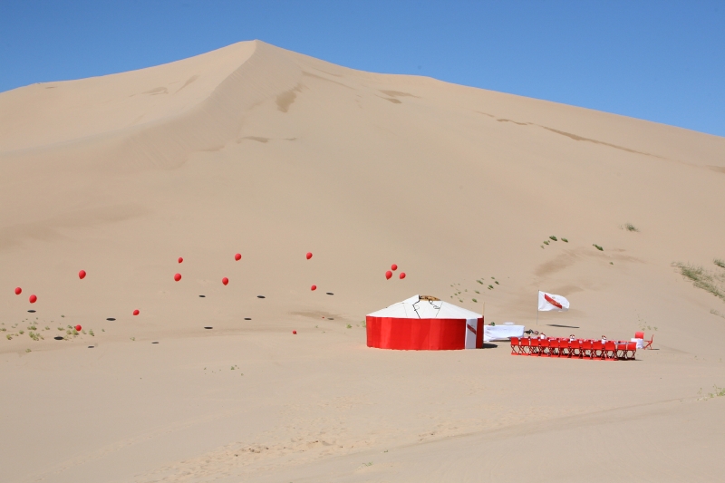 ベージュ色の砂とブルーの空のみの世界に、G.H.マムのシンボルカラーである真紅が引き立つ。ゴビ砂漠に1日だけ三ツ星レストランが登場した。