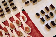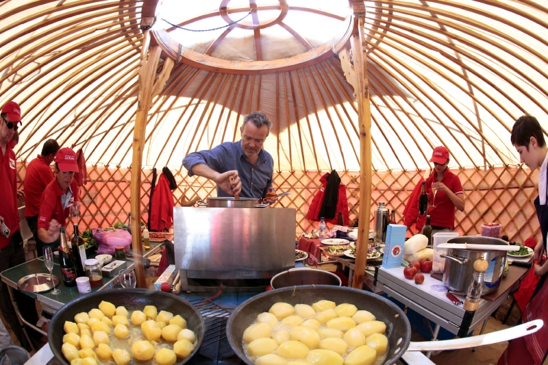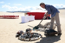 砂漠の真ん中にテントを張り、そのなかで調理をするパサール氏とスタッフたち。テントの外には、綺麗にテーブルがセッティングされ、G.H.マムのシンボルカラーである真紅のカトラリーがベージュの大地に美しく映えていました。こう聞くと、なんともエキゾチックでロマンティックな食事会かと思うものですが、パサール氏にとってはこの環境での料理は大きな挑戦だったようです。「ここでは、日々用いている料理の知識を捨てて調理しました。ゴビ砂漠は乾燥した極限の地であることと、この無謀とも言える企画コンセプトからインスピレーションを受け、モンゴルの食材のみを駆使して作りました。すべての冒険家へのトリビュートの気持ちを込めて」。その言葉のとおり、大きなスコップを使い、砂の上で必死に炭火をおこしている三ツ星シェフ・パサール氏の姿など、パリでは決して見ることはできないでしょう!