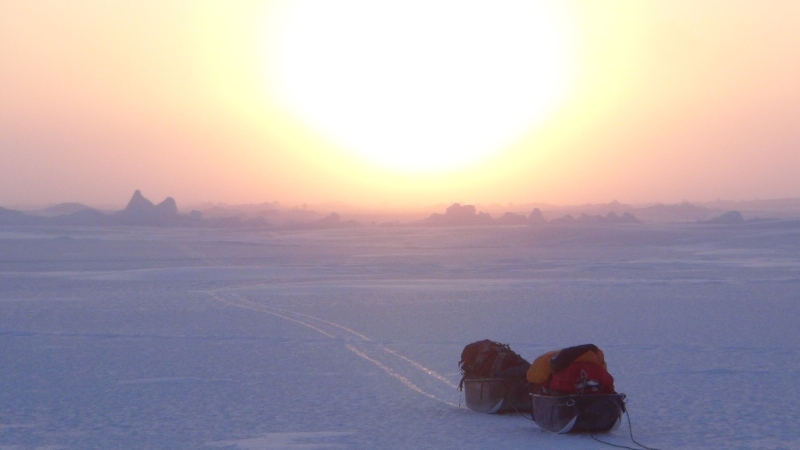 ここで食料や装備などの準備を整え、日本時間3月3日、カナダ最北部にあるエルズミア島ディスカバリー岬から、計110kgのソリ2台をひいて800km、50日間で北極点到達を目指す冒険をスタートさせた。