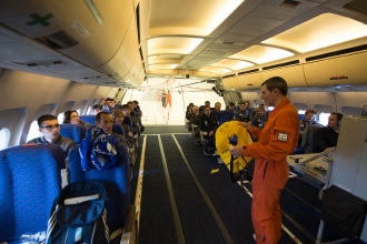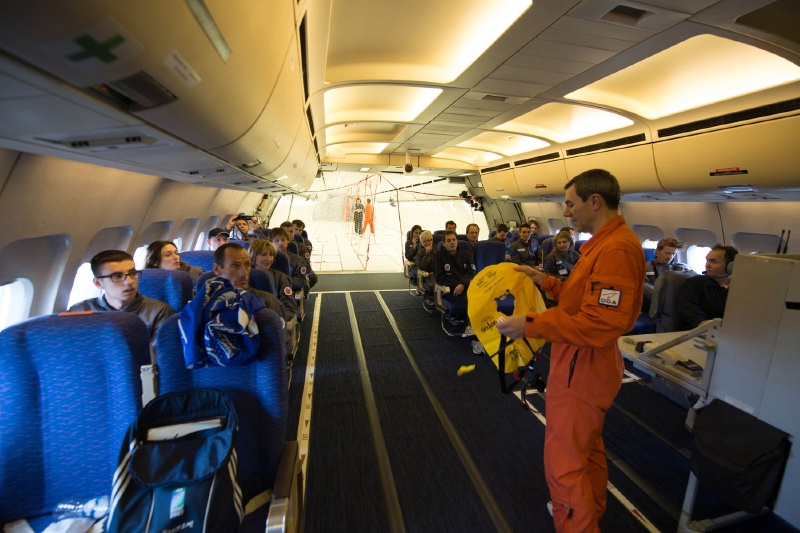 2013年3月15日に行われた初フライト。離陸前に説明を受ける参加者たち。©Novespace-Manue Pedoussaut