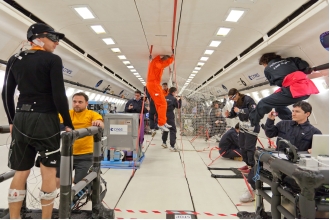 放物線飛行は、火星の低重力(3.8G)下で1回、月の低重力(0.16G)下で2回、そして0Gの無重力状態で12回。それぞれ5分の休憩を置いて実施され、14時30分に着陸するまでに約5分間、無重力を体験したという。