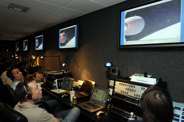 一方、地上では、カリフォルニア州ホーソーンにあるSpaceXの本社には、固唾を呑んで打ち上げを見守るスタッフたちの姿。ロケット切り離しなど重要な 局面をひとつ、またひとつとクリアするたびに、歓声が湧き上がり・・・・・・そしてFalcon1が周回軌道に到達すると、そこは熱狂に包まれました。そ の瞬間を想像するだけで、鳥肌が立ちますね!!