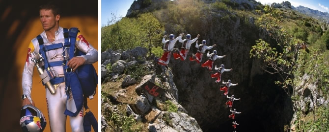 左:飛び降りる高さと共に、ウィングスーツもチャレンジへの重要な要素。成功へ向けて様々なハードルをクリアしていくことが楽しくて仕方がないらしい。