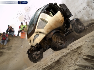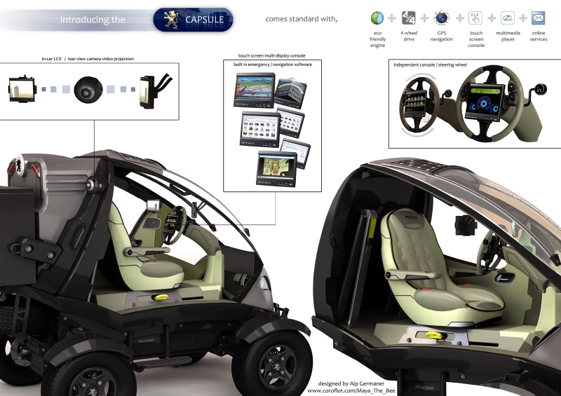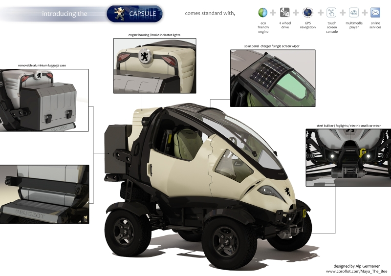 「自由にワンタッチで操作できるハイテクノロジーを備えた、楽しい車をつくりたかったんだ」とGermaner氏。文字通り、「キャプシュール」=カプセ ルのようなユニークな姿ながら、全地形での走行が可能で、衛星によるGPSに対応。動力は、ルーフのソーラーパネルから得られる太陽光発電エネルギー。車 体後部にランドセルのようなトランクを背負い込み、一泊分の旅行荷物程度なら十分に収納可能だそう。