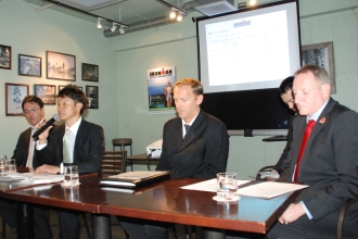 左から濱野清正氏(洞爺湖温泉協会副会長)、白戸太朗氏(アスロニア代表)、ジェフ・メイヤー氏(アイアンマン・アジアパシフィックCEO)、メイ・リッキー氏(エンデュランススポーツ・ジャパン代表)。