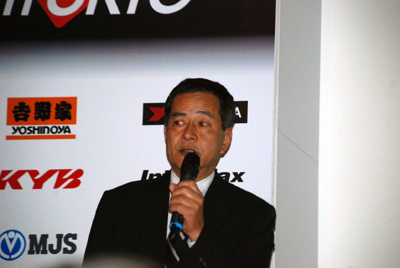 真っ白なチームシャツにインディゴジーンズ姿、そして軽快な足取りでステージの上に立った片山右京。「僕たちはスポーツとしてトップを目指すという究極の目的を果たすと同時に、自分たちがやっている活動に社会性を持たせ、必要とされる存在であり続けることが重要だと考えています。また全力で戦うことで自分たちを磨きながら楽しみたいという思いでこの活動を行なっています」と、引き締まった表情で記者会見冒頭にこう挨拶した。